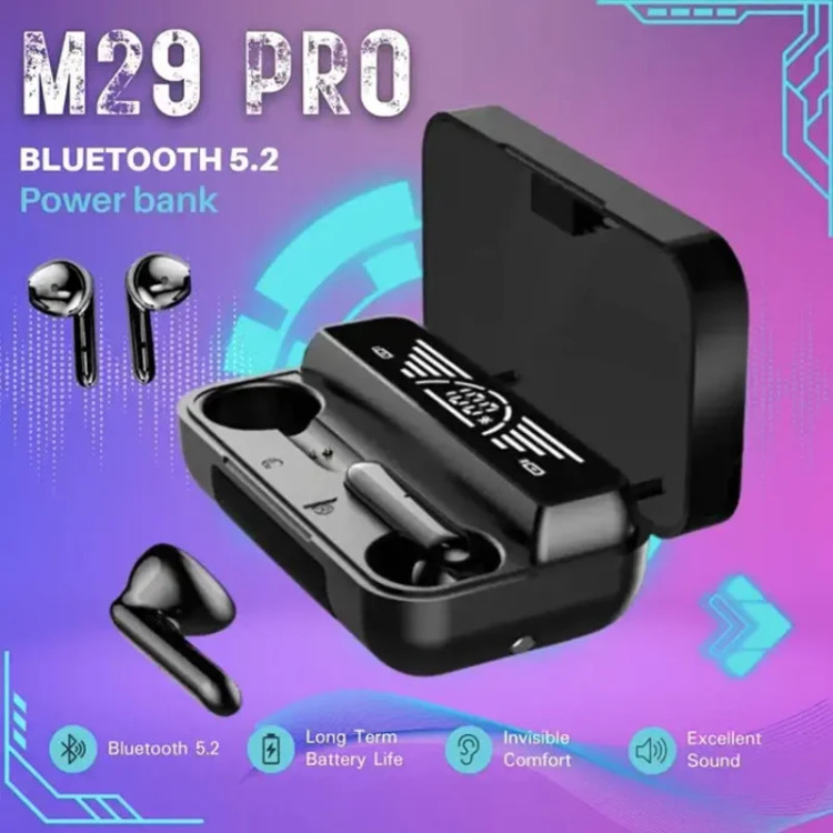 ایرپاد M29 Pro Newest V5.2 همچنین دارای پاوربانک اضطراری برای شارژ گوشی است ، که در مواقع اضطراری میتوان درصدی از باتری گوشی و لوازم جانبی مثل ساعت هوشمند را شارژ کرد.